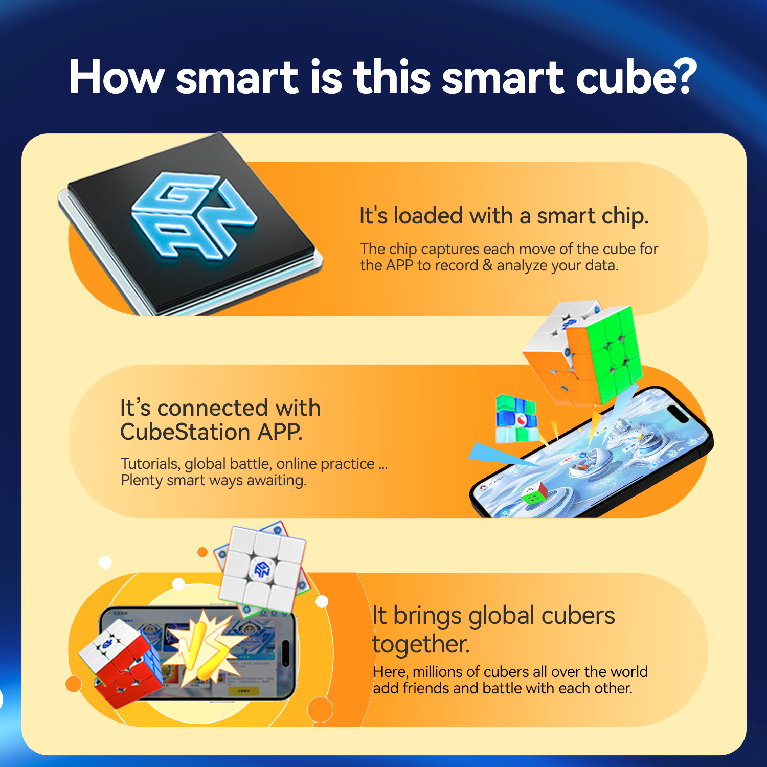 🚀 GAN356 i Carry E:智能扭計骰新世代,滿電起飛! 🎮 🧠 智慧學習,從零開始 搭載智慧晶片,結合 CubeStation APP,提供名師教學、動畫復原、數據分析等功能,讓你輕鬆學會扭計骰。 🎯 競賽級手感設計 採用蜂巢與滑軌接觸面,鎖油降阻,長久順滑;90° 角容錯,轉動更流暢。 🔋 超長續航,隨時開戰 創新雙電池結構,提供 150 小時電池壽命,隨時隨地與全球玩家對戰。 📱 智能連線,全球競技 透過 CubeStation APP,參與擂台賽、排位賽、房間賽等多種競賽玩法,與全球骰友一同競技。 🚀 GAN356 i Carry E – The Next-Gen Smart Cube, Fully Charged and Ready to Fly! 🎮 🧠 Smart Learning, Start from Zero Equipped with an intelligent chip and fully integrated with the CubeStation APP, this cube offers pro-level tutorials, animated solve guides, and data analysis, helping you master cubing step by step. 🎯 Competition-Tier Handfeel Design Featuring honeycomb and track-style contact surfaces for long-lasting smoothness and reduced friction, plus 90° corner-cutting for seamless, fluid turns. 🔋 Ultra-Long Battery Life, Always Ready for Battle With an innovative dual-battery structure, enjoy up to 150 hours of playtime, ensuring you're ready for global battles anytime, anywhere. 📱 Smart Connectivity, Compete Globally Join CubeStation APP events like challenges, ranked matches, and room-based games, competing with cubers from all around the world in diverse modes.