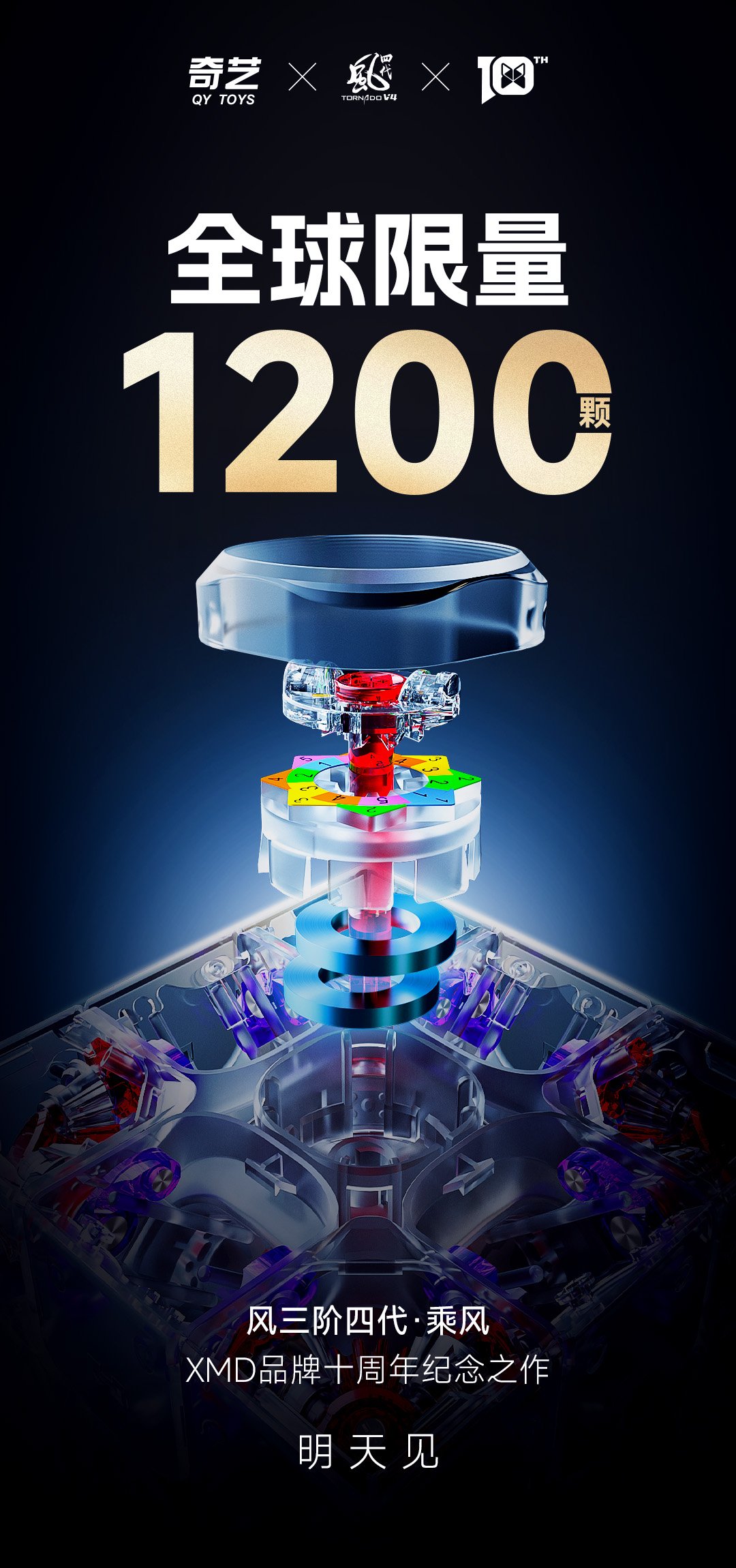 奇藝 QY 聯乘 X-Man Design (XMD) 推出 風三階四代「乘風」版 —— 為慶祝品牌十周年而生的紀念之作。全球限量 1200 顆,專屬禮盒內附身份卡、手環、特製貼紙及完整配件。承襲 Tornado V4 的旗艦性能,結合創新磁懸浮系統、雙重磁定位、可視化調節設計與 UV 鑽面工藝,既是專業比賽級扭計骰,也是收藏級珍品。