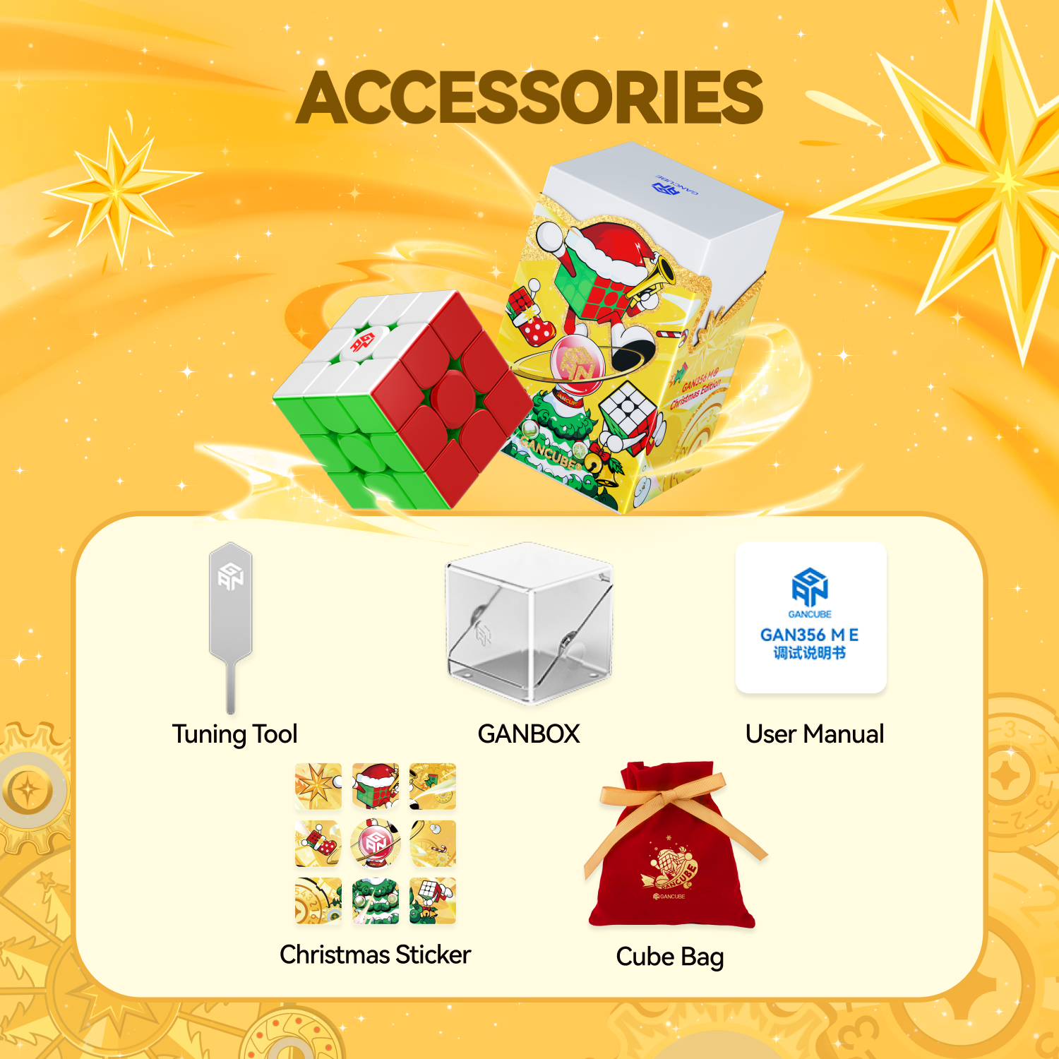 Celebrate the holidays with the GAN 356 M E Christmas Edition — a festive redesign of GAN’s beloved 3x3, now presented in a limited-edition Christmas package. Featuring 48 magnetic capsules, the latest GES Pro+ tension system, and a Wing-Shaped Core 2.0, it delivers the same silky-smooth performance you expect from GAN, wrapped in a holiday spirit of joy and precision. The cube arrives in a special Christmas gift box with exclusive accessories — including a tuning tool, GAN box, cube bag, user manual, and a festive Christmas sticker — making it the perfect gift for cubers of all ages. Whether you’re competing, collecting, or gifting, this cube captures the essence of the season — evergreen smoothness and endless progress. ✅ 🎅 LIMITED HOLIDAY EDITION – CHRISTMAS MAGIC UNWRAPPED! Celebrate the season with the GAN 356 M E Christmas Edition, featuring a red-green colorway, Santa-style accents, and a golden festive gift box. Exclusive to this release — once it’s gone, it’s gone! ✅ 🎁 THE PERFECT GIFT FOR A GIFTED MIND Packed in a collector’s holiday box with a cube bag, Christmas sticker, tuning tool, and GAN Box. Ready to gift — no wrapping needed. Bring a smile to every cuber’s Christmas morning! ✅ 🧲 48 MAGNETIC CAPSULES + GES PRO+ SYSTEM Smooth, stable, and snappy! Enjoy precise alignment from GAN’s Turbo Magnetic Capsules and fully adjustable GES Pro+ tuning for a customized, silky turning feel. ✅ ✨ FESTIVE DESIGN + FLAGSHIP TECHNOLOGY Red-and-green color theme inspired by holiday cheer — yet powered by a Wing-Shaped Core 2.0 and Honeycomb 2.0 slide-track surface for elite-level performance. ✅ GES PRO+ TUNING SYSTEM 🔧 – Customize your cube with advanced elasticity and tension control. Adjust in seconds to find your perfect setup — flexible, stable, and competition-ready. ✅ HONEYCOMB 2.0 SURFACE 🍯 – The latest GAN honeycomb + slide-track structure reduces friction, enhances lubricant distribution, and delivers ultra-smooth, long-lasting performance. ✅ 🎄 LIGHT, FAST & READY TO RACE IN HOLIDAY STYLE At just 63 g, this compact 3×3 delivers effortless speed and accuracy. Sleek, smooth, and full of Christmas spirit — it’s the cube you’ll love all year round!